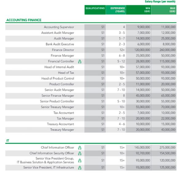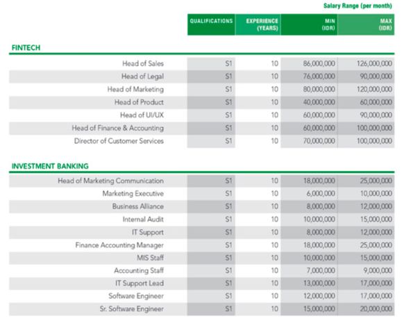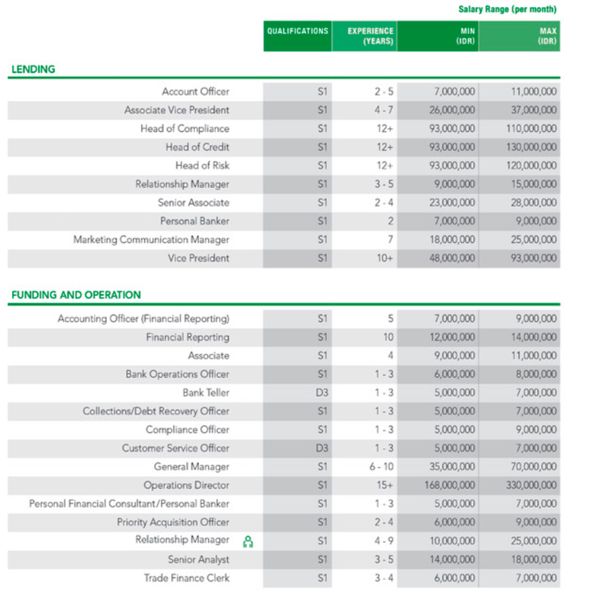Mereka yang bisa mengisi posisi IT di bank, gaji yang ditawarkan tidak tanggung-tanggung, untuk posisi IT infrastructure dan IT Business Solution & Application Services bisa mendapatkan range gaji antara Rp 93 juta sampai Rp 125 juta, dengan 15 tahun berpengalaman.