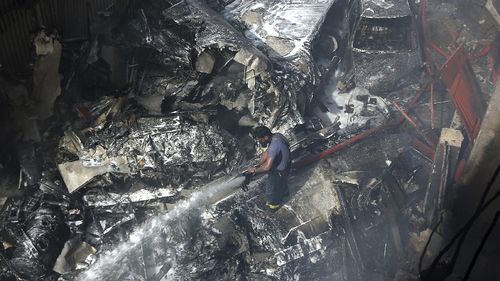 Foto: Kecelakaan Pakistan International Airlines (AP/Fareed Khan)A firefighter tries to put out fire caused by plane crash in Karachi, Pakistan, Friday, May 22, 2020. An aviation official says a passenger plane belonging to state-run Pakistan International Airlines carrying more than 100 passengers and crew has crashed near the southern port city of Karachi. There were no immediate reports on the number of casualties. (AP Photo/Fareed Khan)