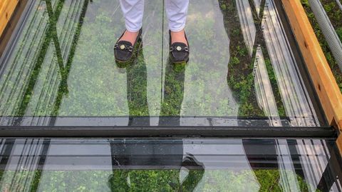 Jembatan ini melintasi lembah di Pegunungan Great Smokey dan memiliki tiga panel kaca di tengahnya yang memungkinkan pengunjung melihat pemandangan setinggi 42 meter di bawahnya.