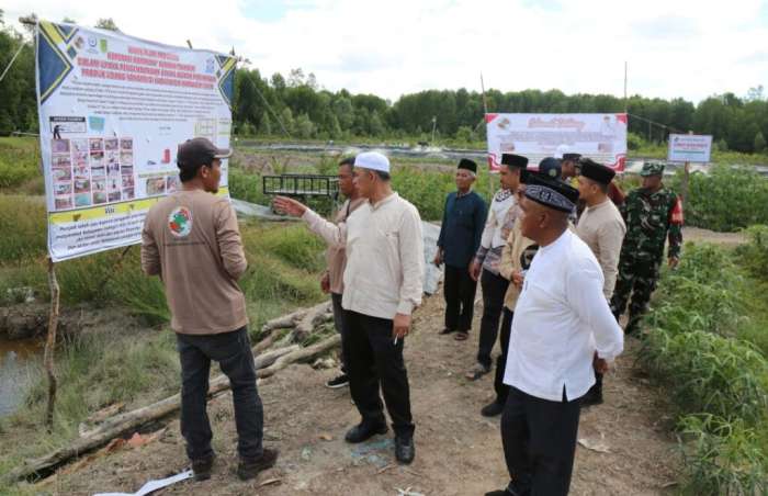 Bupati H. Herman saat panen di tambak di Kelurahan Kuala Enok Kecamatan Tanah Merah.(Foto: Diskominfotik)