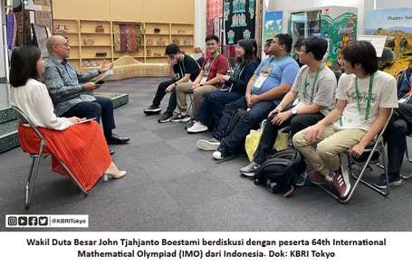 Wakil Duta Besar John Tjahjanto Boestami apresiasi pemenang Medali Tim Indonesia pada 64th International Mathematical Olympiad (IMO) di Chiba, Jepang. Dok: KBRI Tokyo