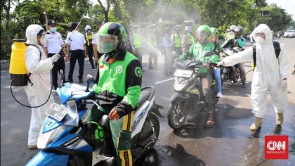 Penyemprotan disinfektan kepada para pengemudi ojek online (ojol) untuk mencegah penyebaran virus corona. (CNN Indonesia/Farid)Komisaris Utama PT Pertamina (Persero) Basuki Tjahaja Purnama alias Ahok menyatakan perusahaannya memberikan bantuan kepada pengemudi ojol demi meredam dampak pandemi virus corona.