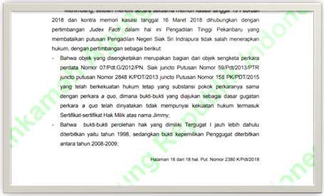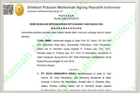 "Ini baru sebahagian kecil SHM yang tumpang tindih dengan SK Pelepasan Kawasan Hutan Nomor 17/Kpts-II/1998, masih banyak perkara-perkara serupa yang kandas di pengadilan diantaranya 42 SHM milik saudara Jimmy pada Kasasi II berdasarkan Putusan Mahkamah Agung Nomor 2380 K/Pdt/2018 tanggal 23 Oktober 2018 juga memutuskan sertipikat-sertipikat hak milik atas nama Jimmy tidak memiliki kekuatan hukum, dan permohonan kasasi saudara Jimmy ditolak," beber Anton sembari menyatakan statemen LSM Perisai menyesatkan lagi provokatif.